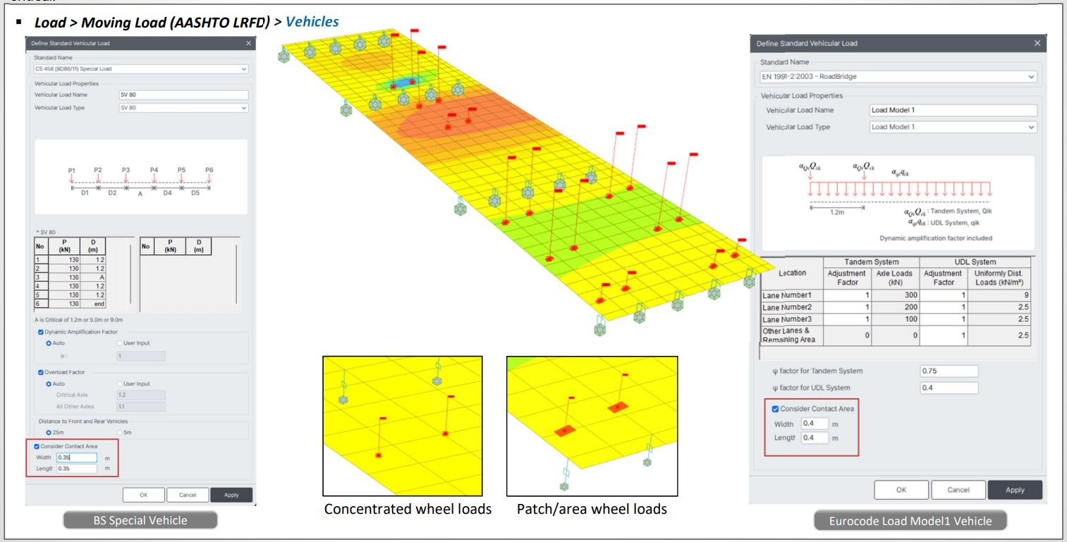 Dotykovou plochu kola lze nyní použít během analýzy pohyblivého zatížení nejen pro vozidla AASHTO LRFD (jako v předchozích verzích), ale také pro vozidla definovaná v normách Eurocode, BS a novozélandských normách.