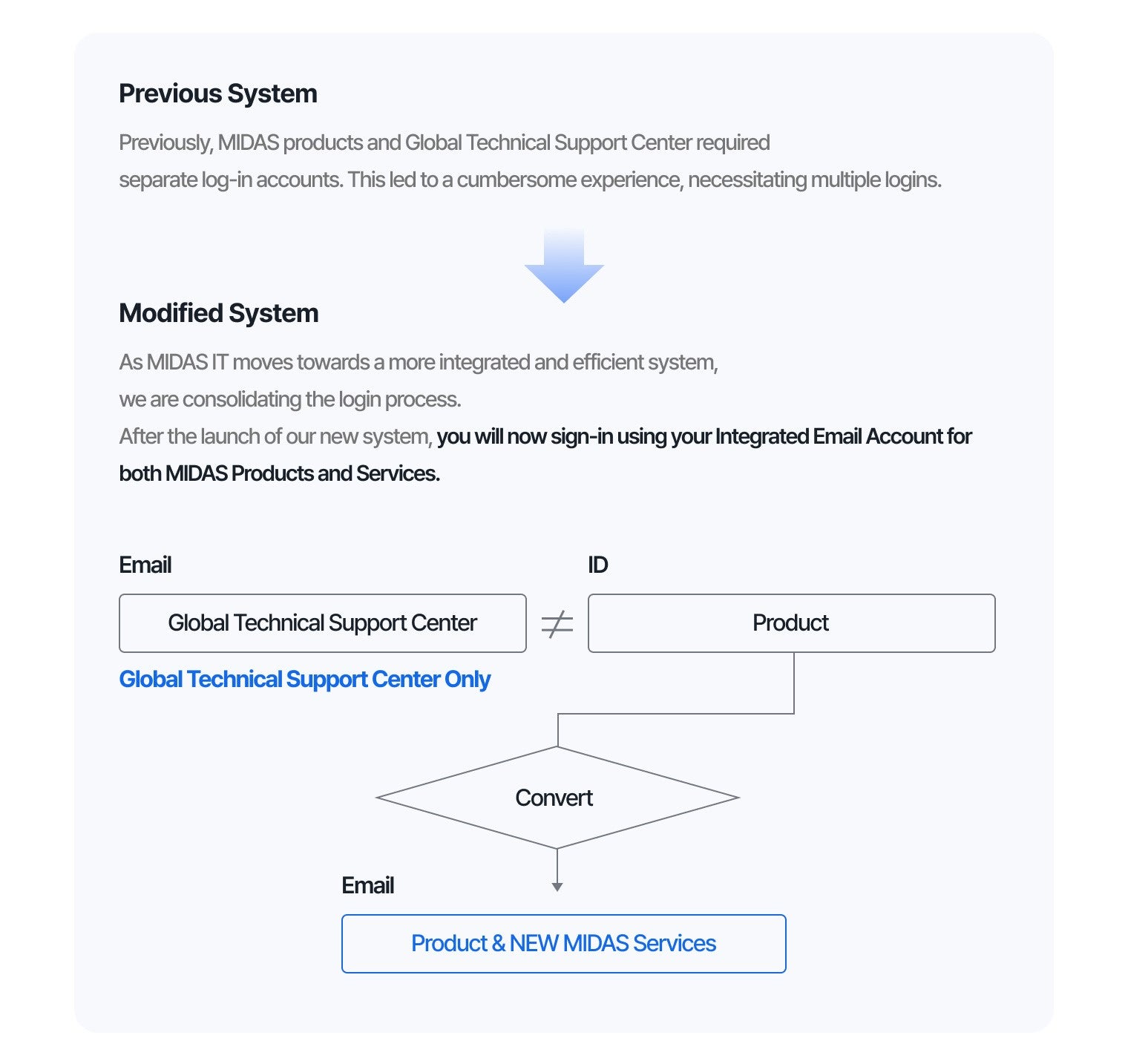 Pokud jste dříve chtěli použít zákaznickou technickou podporu midasu, museli jste mít speciální extra účet, který nijak nesouvisel s vaším účtem, na kterém jste měli licenci k vašemu sotftwaru. Toto se však mení.